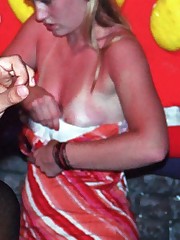 Girls offering real down blouse fun