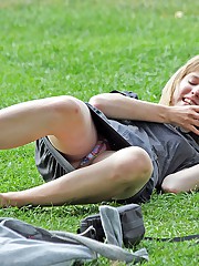Crossed legs upskirt, of cute blonde peeked in a park.